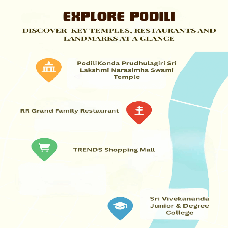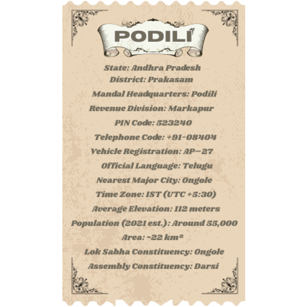 Podili is a charming town located in the Prakasam district of Andhra Pradesh, known for its natural beauty, peaceful atmosphere, and rich cultural heritage. Nestled amidst small hills and lush greenery, Podili offers a serene environment that beautifully blends nature with simplicity. The town is surrounded by fertile lands, where agriculture remains the main source of livelihood for many locals. Podili is also famous for its nearby hills, especially the Podili Hill, which attracts visitors with its scenic views and calm surroundings. The gentle breeze, clear skies, and beautiful sunrise make it a delightful place for nature lovers. Over the years, Podili has grown steadily with the development of schools, colleges, and modern facilities while maintaining its rural charm. The local markets buzz with activity, offering fresh produce, traditional snacks, and handmade goods. People of Podili are known for their hospitality, kindness, and close-knit community spirit. The town celebrates festivals with great enthusiasm, filling the streets with color, music, and devotion. Sri Venkateswara Swamy Temple is one of the notable religious sites that draws devotees from nearby areas. Podili’s surroundings include small streams and green fields that add to its natural charm, making it a pleasant spot for short drives and picnics. The nearby hills also make it an ideal place for trekking and photography. Despite its calm appearance, Podili is developing in education and small-scale industries, paving the way for youth employment and progress. The clean air and peaceful lifestyle make it a great place to live away from urban chaos. It’s well connected by road to nearby towns like Kanigiri, Darsi, and Ongole, enhancing its accessibility. Podili’s people take pride in their heritage, language, and traditions that reflect the true essence of rural Andhra Pradesh.